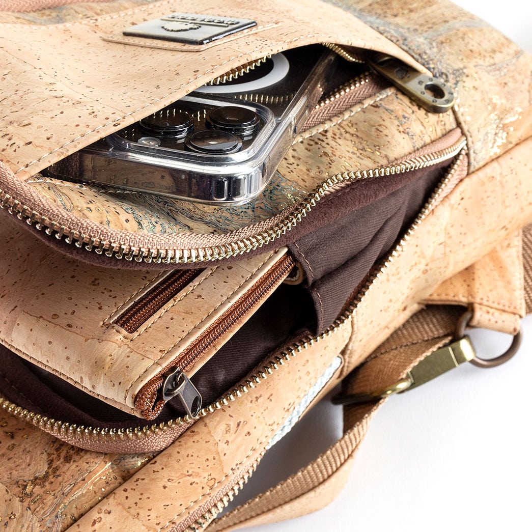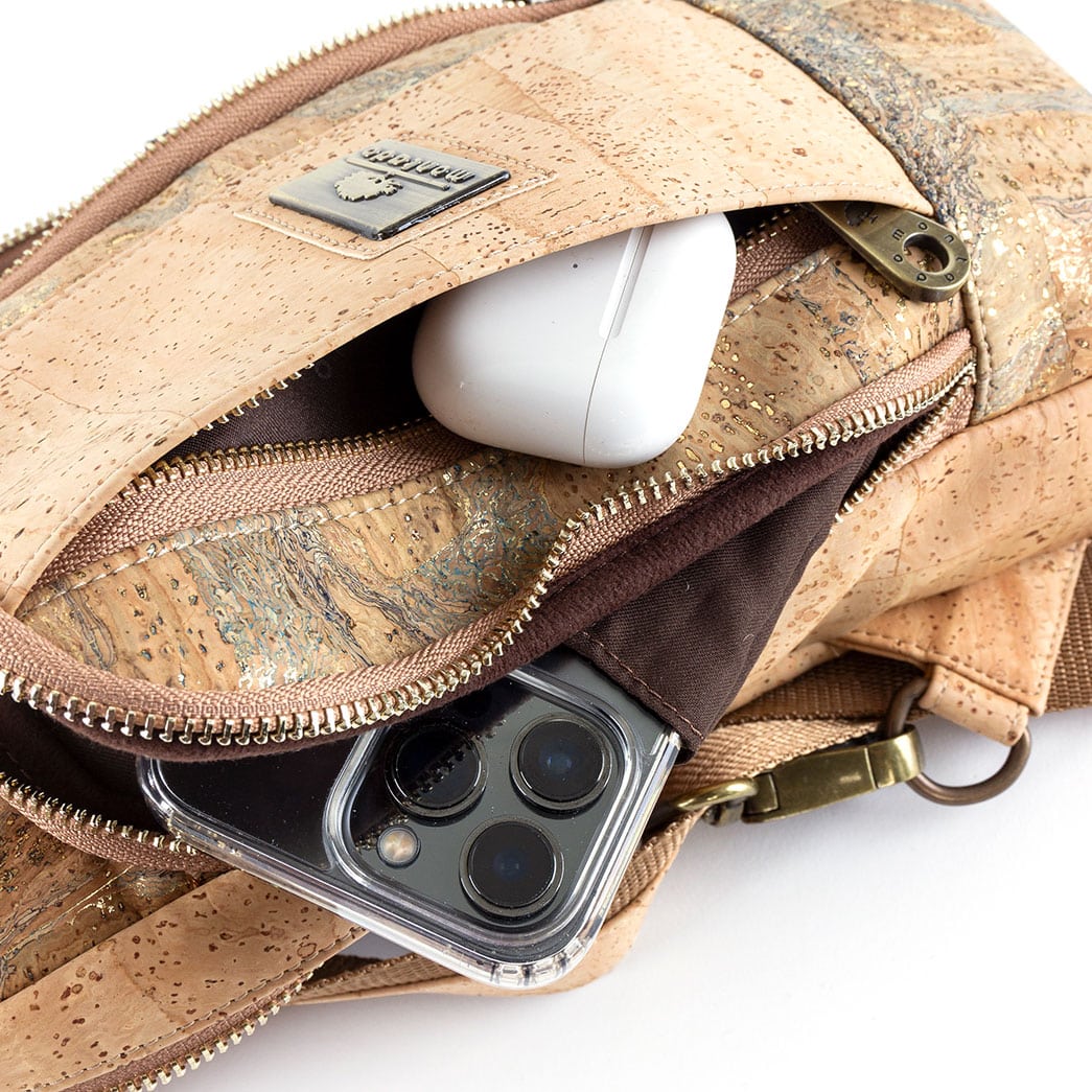 Brusttasche «Natural Taco» aus Kork mit breitem, verstellbarem Trageriemen sowie vielen Reissverschlussfächern.