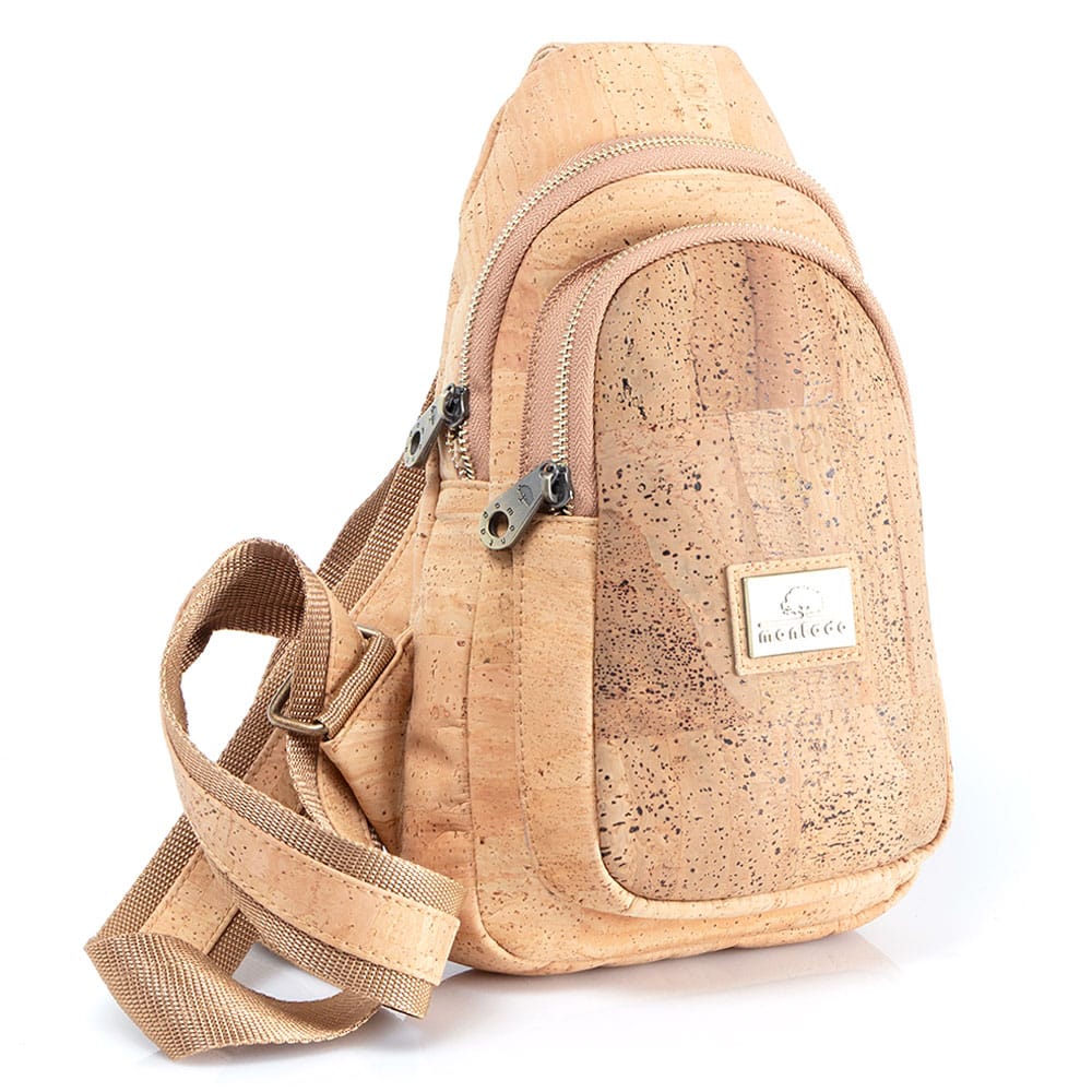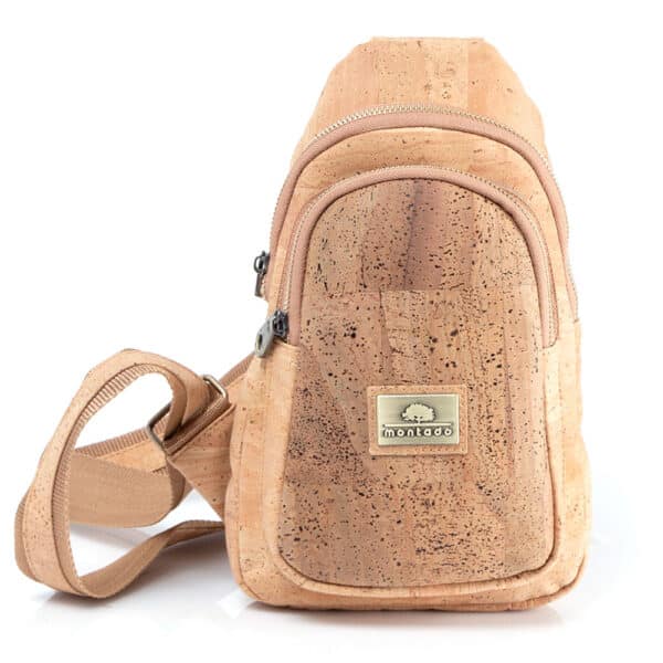 Praktische Brusttasche «Taco» aus Kork von Montado mit verstellbarem Trageriemen sowie Reissverschlussfächern.
