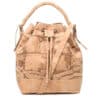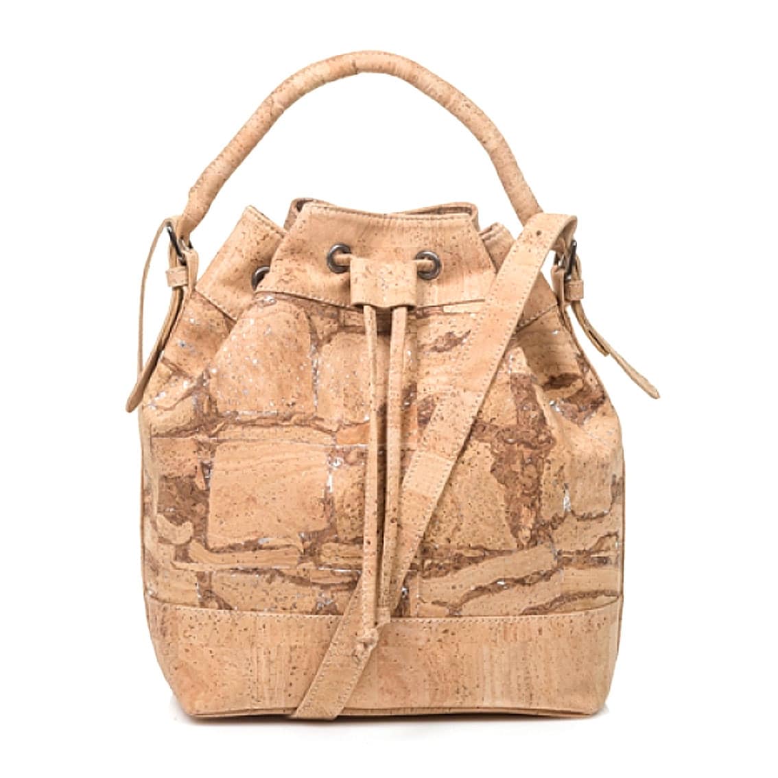 Bucket Tasche «Kenia» aus Kork von Marla Pais mit abnehmbarem Trageriemen. Mit Kordelverschluss sowie zusätzlichem Magnetknopf für mehr Sicherheit. Naturkork mit silbernen Einschlüssen.