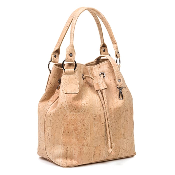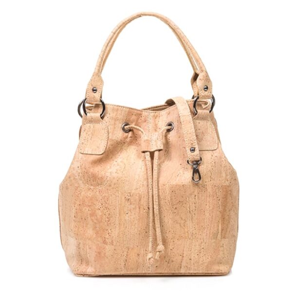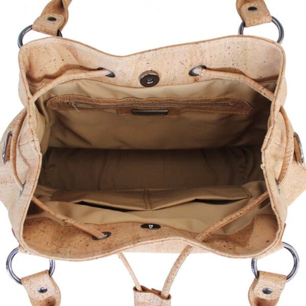 Grosse Beuteltasche aus Kork «Karatu» von Marla Pais mit abnehmbarem Trageriemen. Hauptfach mit Kordelverschluss sowie Fächer im Innenbereich.