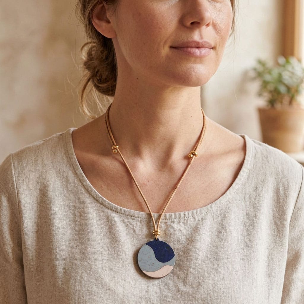 Die Halskette aus Kork «Inspira Blue» ist ein nachhaltiges Modeaccessoire aus Portugal. Handgemacht, fair produziert und wunderschön!