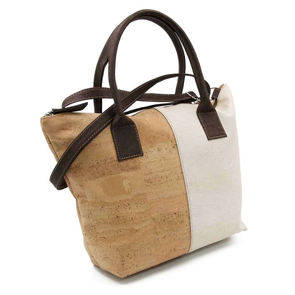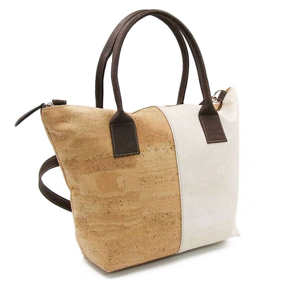 Die Korktasche «Palma White» von Yelafox hat eine zweifarbige Oberfläche an der Frontseite. Die Tasche punktet mit dem aufmerksamkeitsstarken Design einer modischen Shopping-Bag.