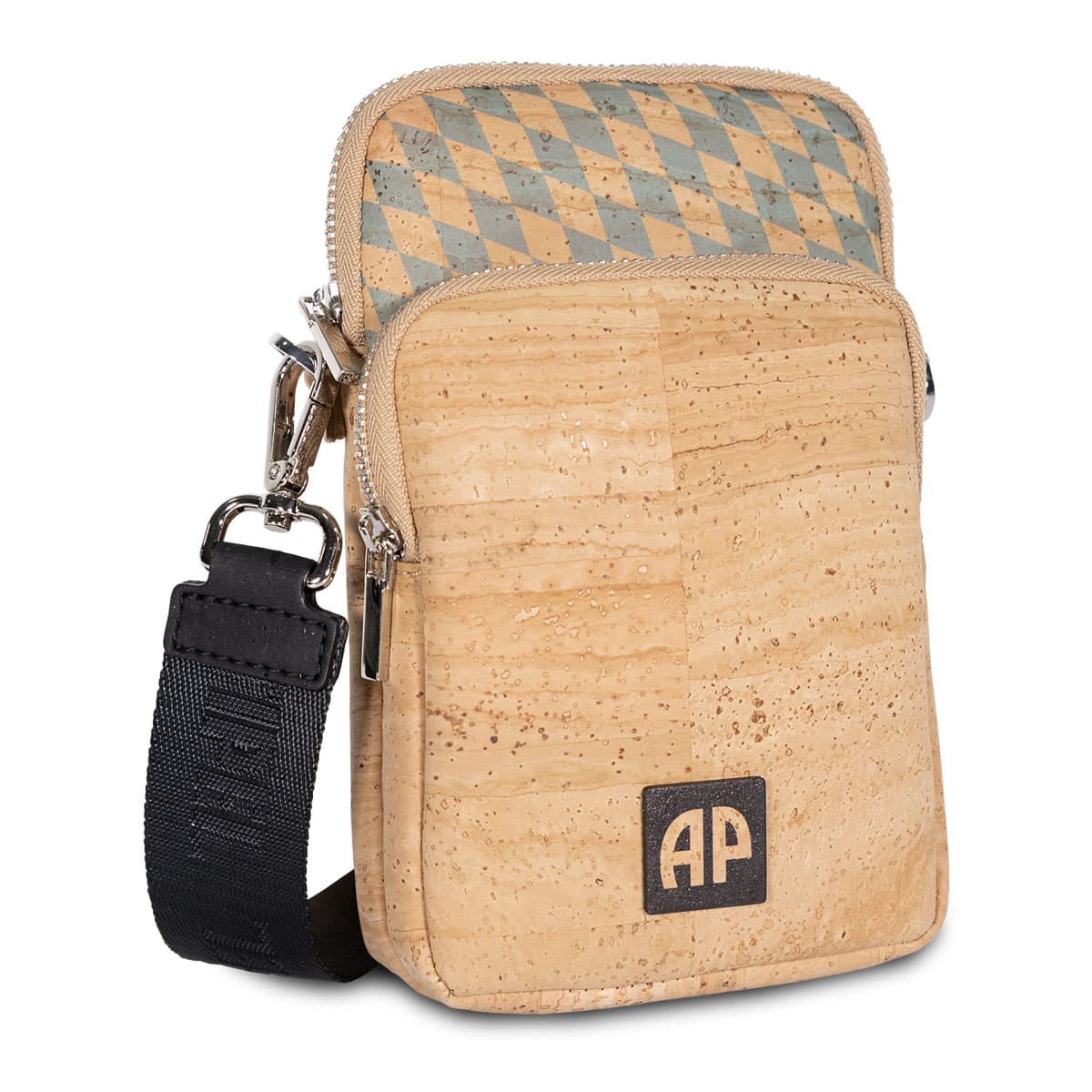 Handytasche aus Kork «Laborie» von Artipel mit blauen Elementen seitlich.
