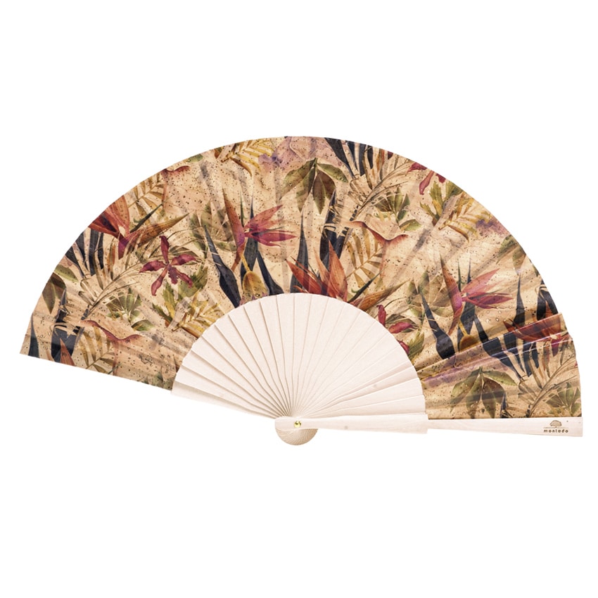Kork Fächer «Tahiti» – ein nachhaltiger, 100% veganer Fächer aus Kork mit farbigem Pflanzenmuster.