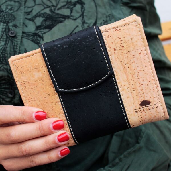 Kork Geldbeutel «Triple» von Montado. Die Korkfarbe ergänzt mit schwarzem Streifen erschafft einen tollen Kontrast!
