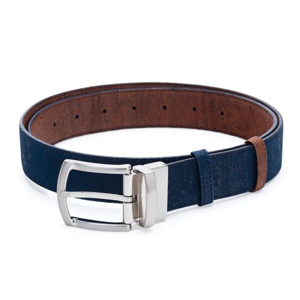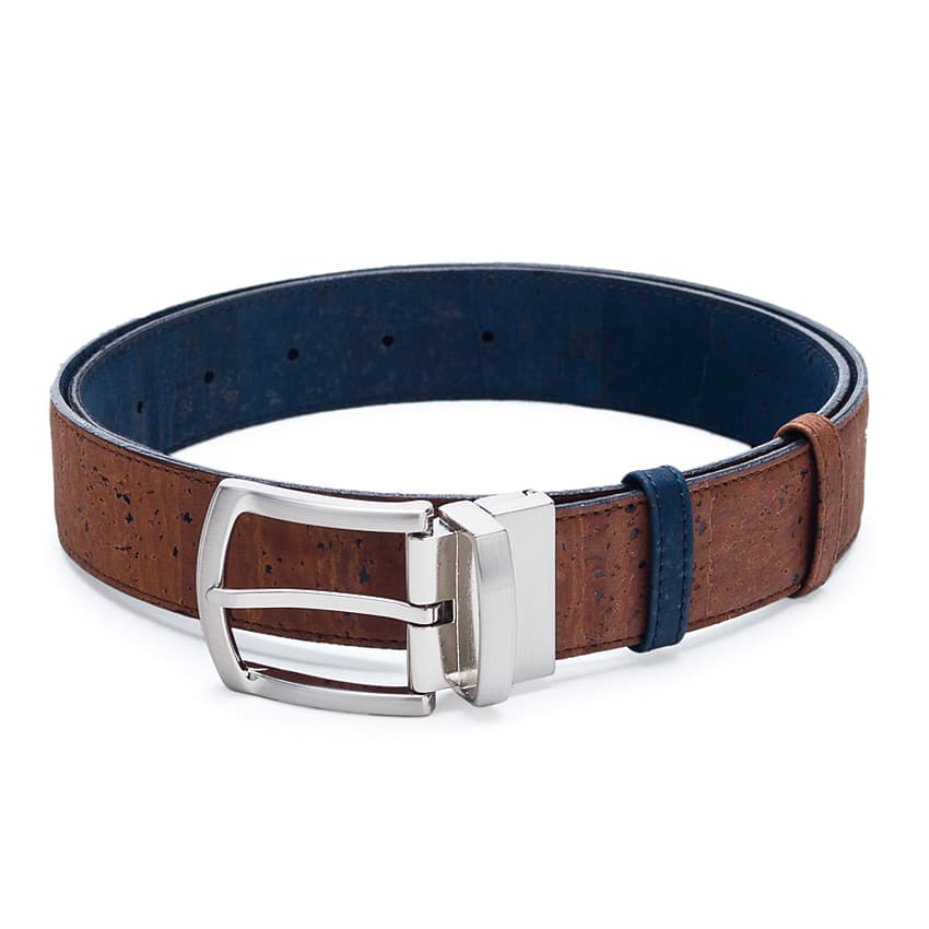 Kork Gürtel «Reversible» blau/braun von Artelusa. Wechsle die Farbe deines Gürtels nach Belieben! Die verstellbare Gürtelschnalle machts möglich.