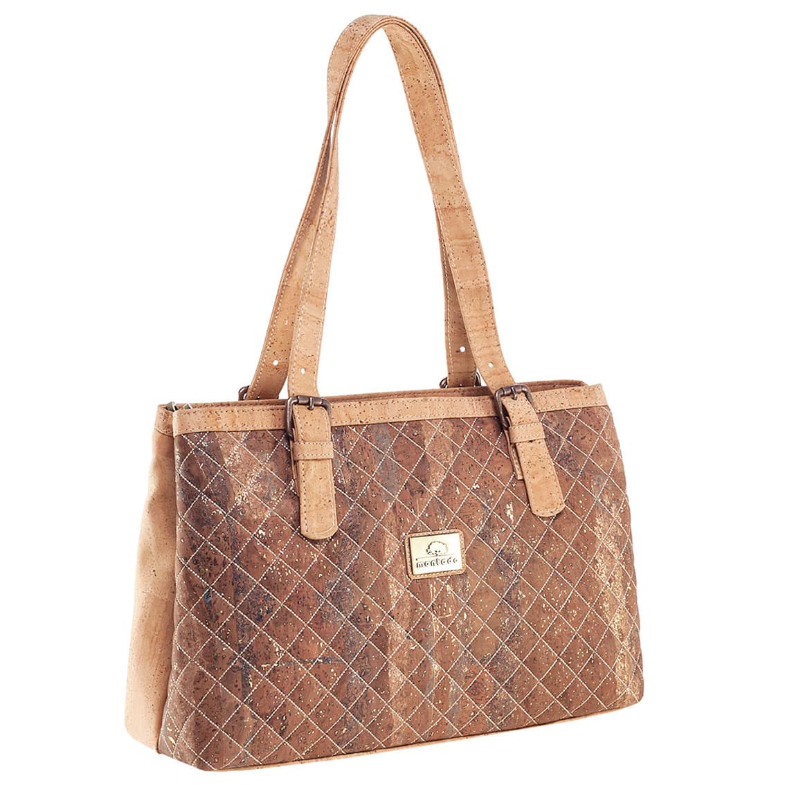 Die Kork Handtasche «Brown Stitch» von Montado hat 2 grosse Hauptfächer, Einschub- sowie Reissverschlussfach im Innenbereich