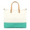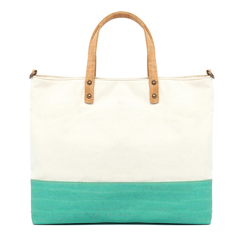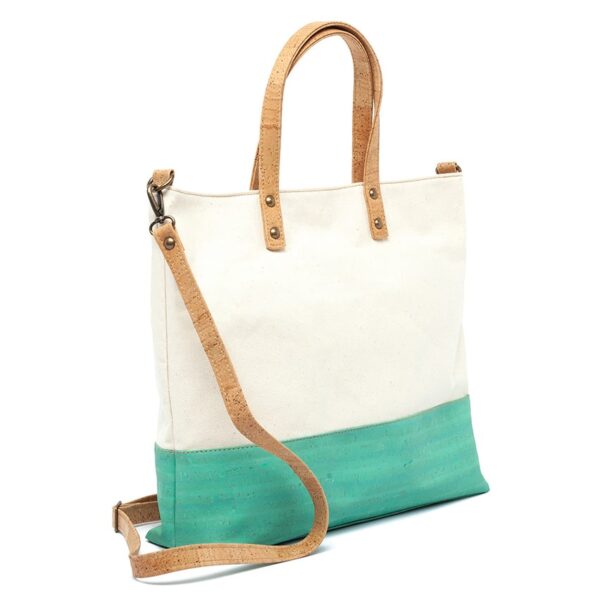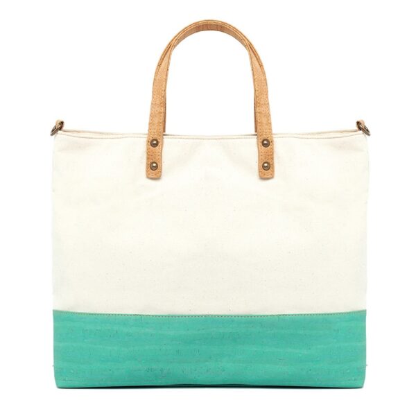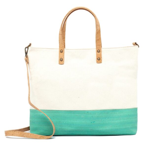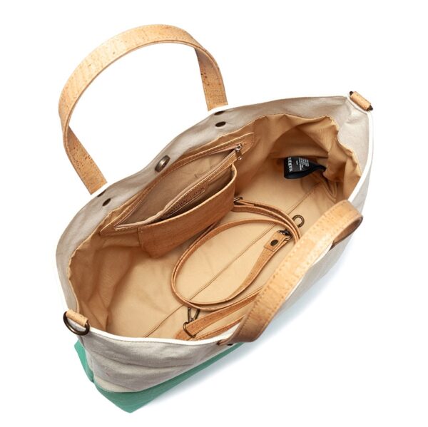 Kork Handtasche «Green Stripe» von Artelusa. Vegane Korktasche mit weisser Baumwolle und türkis eingefärbtem Korkstreifen.