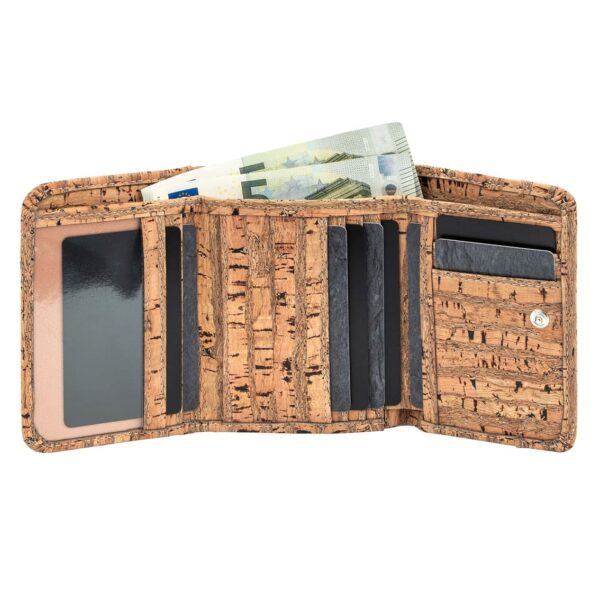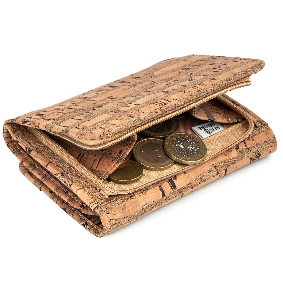 Kork Portemonnaie «Reyna» raizes von Simaru. Diese Geldbörse bietet Platz für 8 Karten plus Sichtfach! Zusätzlich gibt es ein grosses Fach für Scheine und Belege sowie ein extra Münzfach mit Reissverschluss.