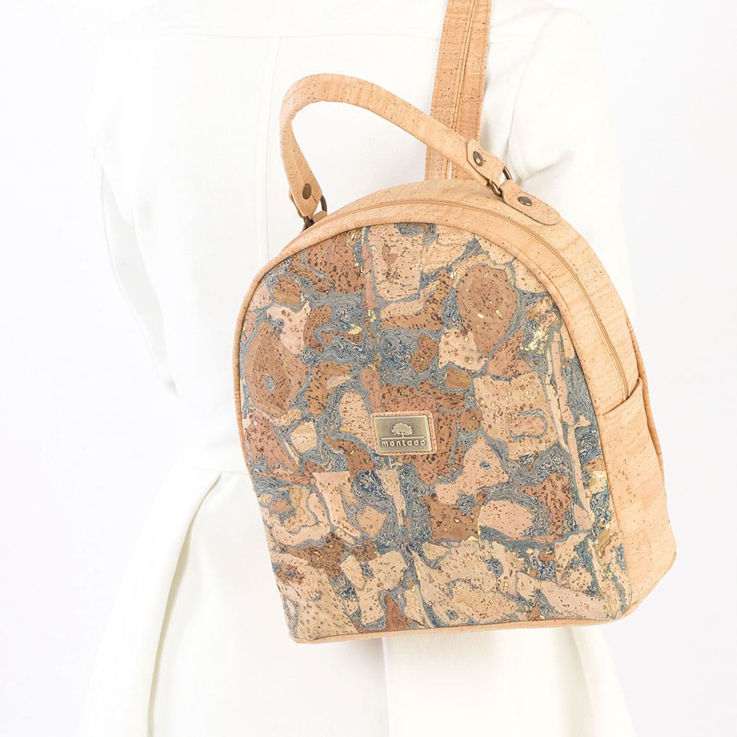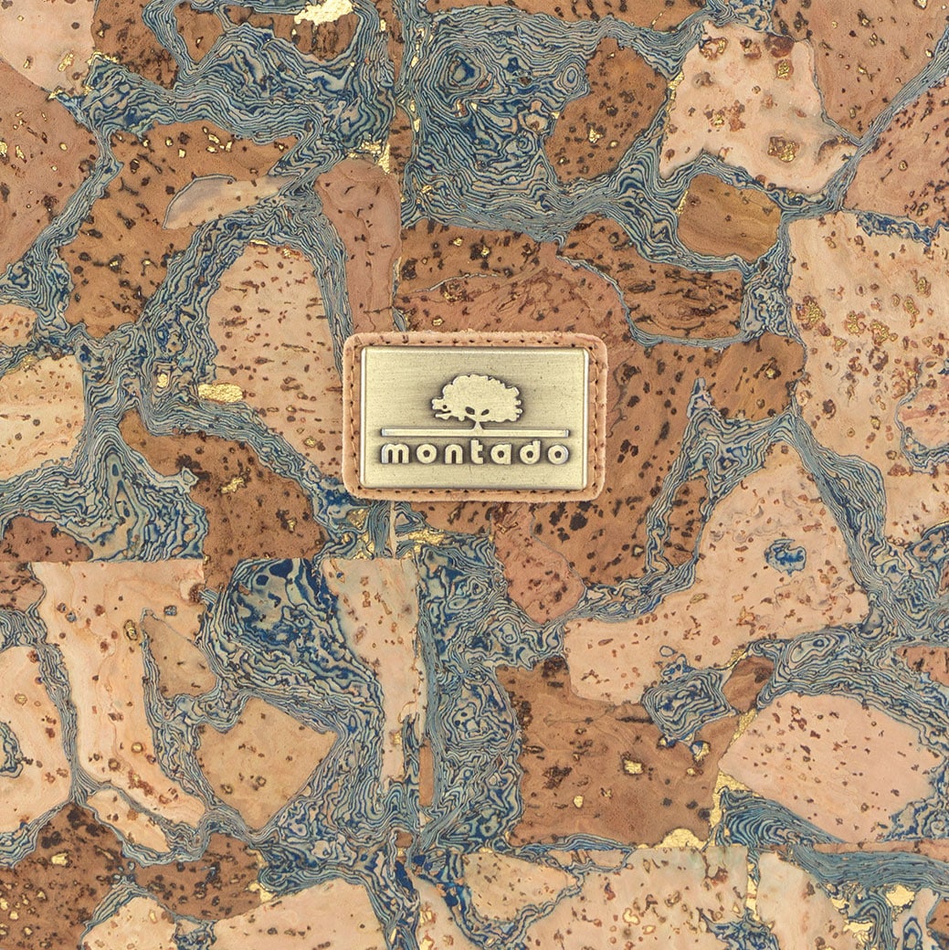 Kork-Rucksack «Raiz» mit blau-braunem Muster sowie goldenen Einschlüssen.