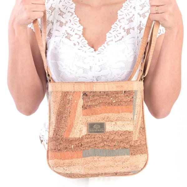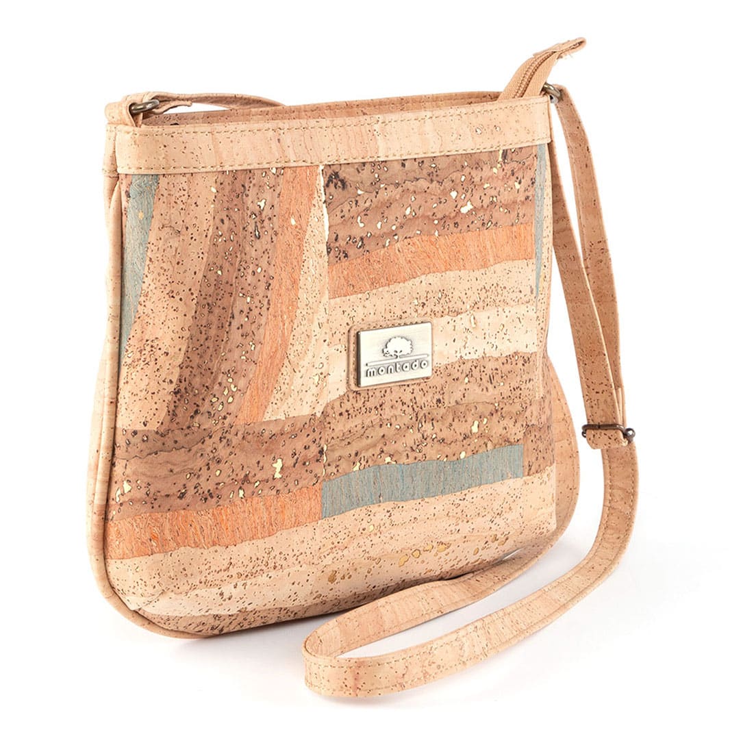 Kork-Umhängetasche «Farol Parquet» von Montado mit einzigartigem Korkmuster sowie goldenen Einschlüssen.