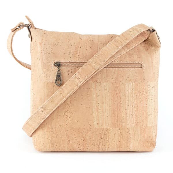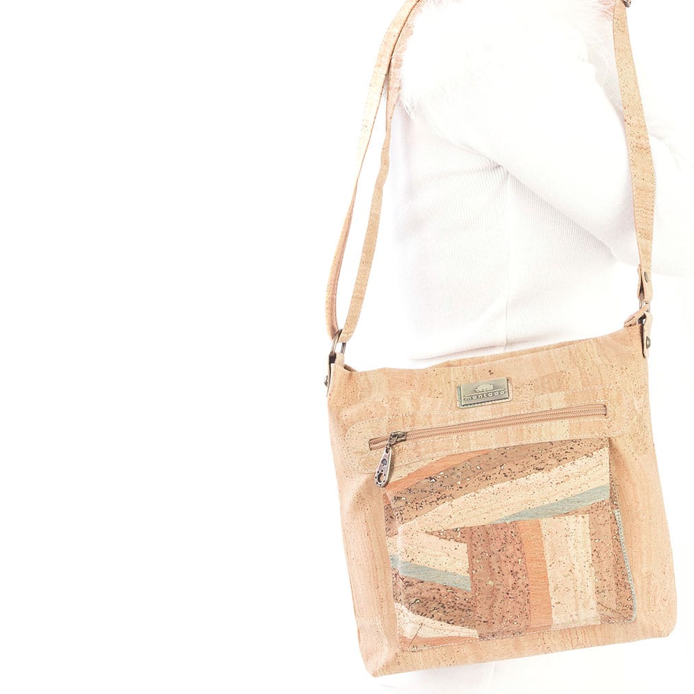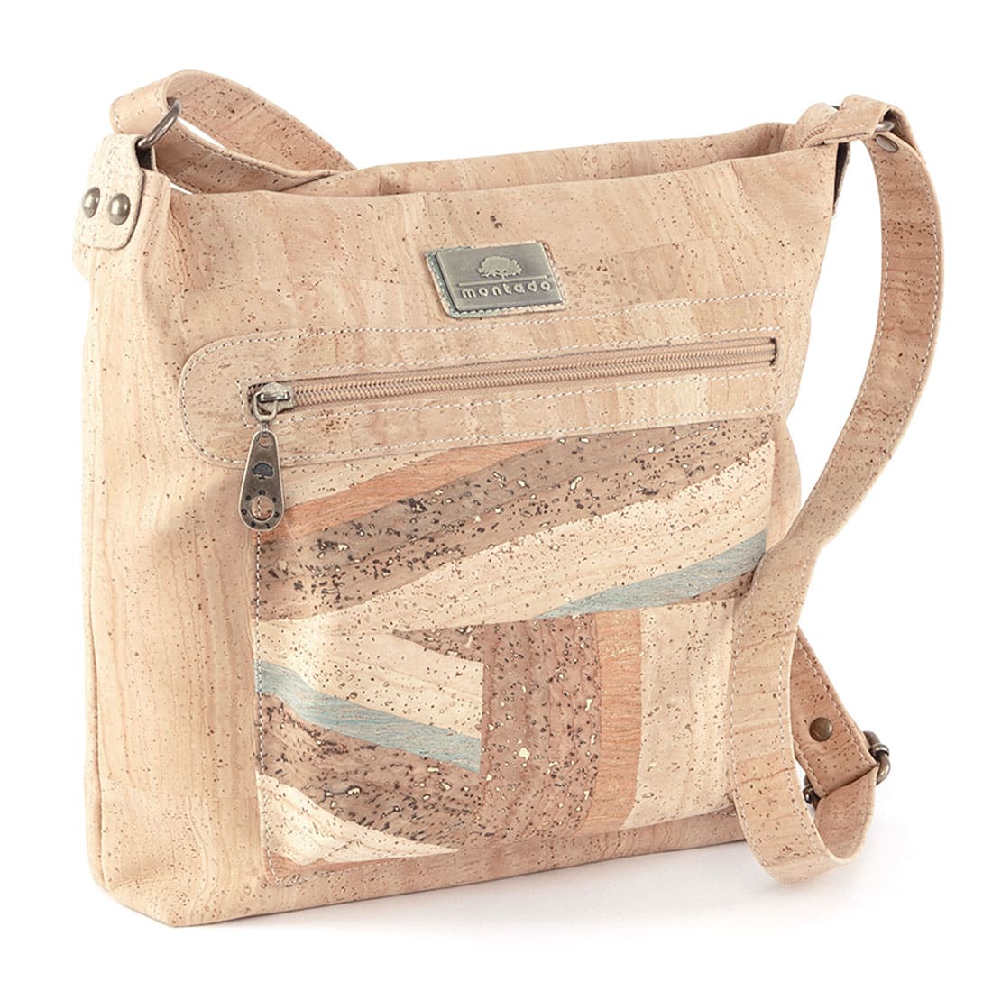 Kork-Umhängetasche «Parquet» von Montado mit Muster auf der Frontseite sowie goldenen Einschlüssen.