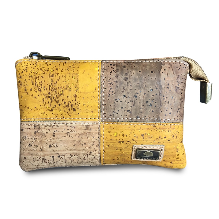 100% vegan hergestellter Beutel in natürlichen Brauntönen und gelb eingefärbten Rechtecken. Haupt- und Seitenfach mit Reissverschluss.