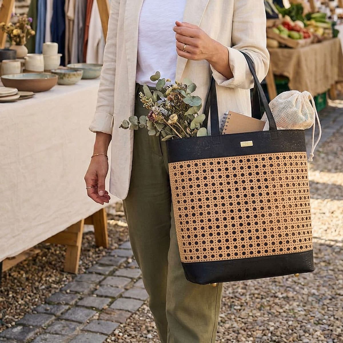 Die Korktasche «Cestaria» mit Lasercut-Muster bietet viel Stil! Die Innentasche kannst du nach Belieben entfernen (Druckknopf-Verschluss).