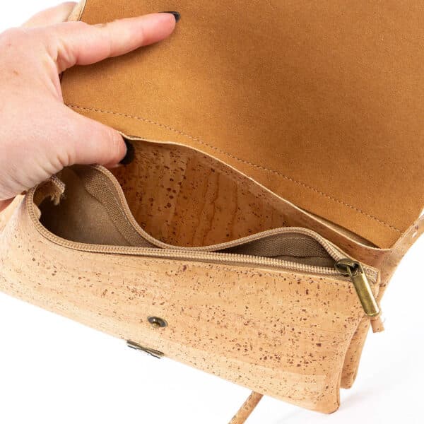 Die kleine Korktasche «Dominica Azul» hat insgesamt 3 grosse Fächer für Portemonnaie, Handy usw. – die perfekte Grösse!