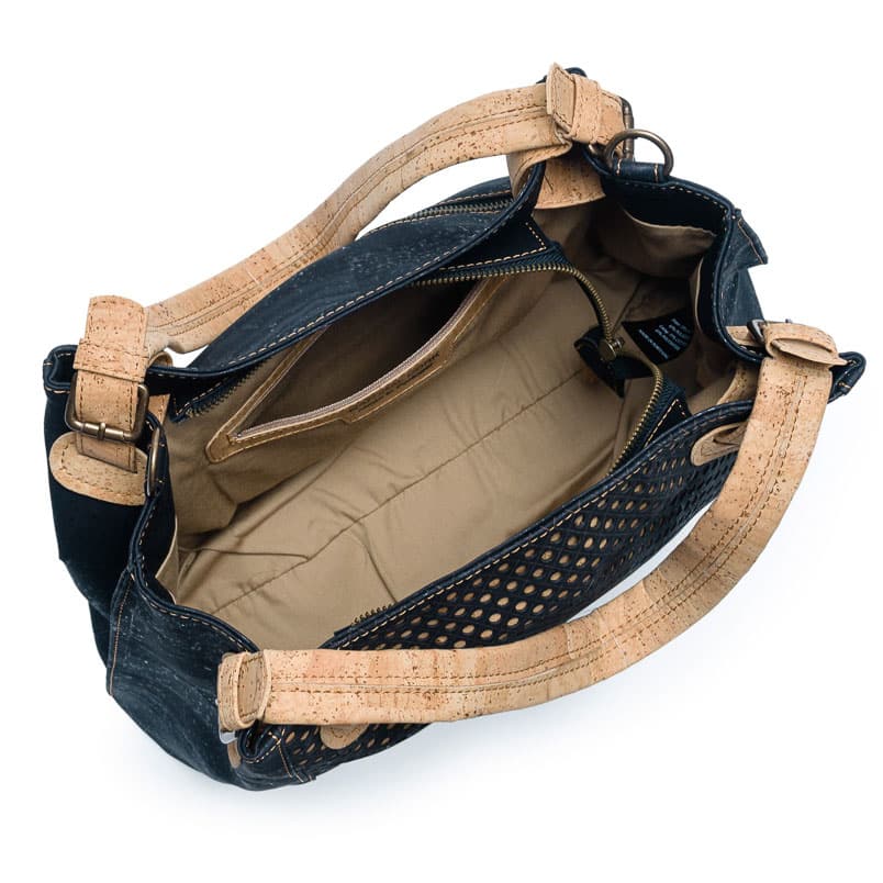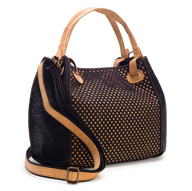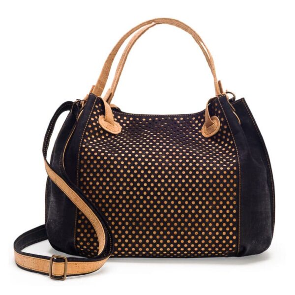 Korktasche für Damen «Ponto L» schwarz von Artelusa. Schwarz eingefärbter Kork mit Lasercut. Kann auch als Umhängetasche verwendet werden.