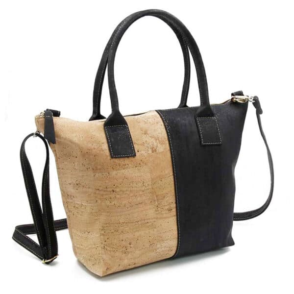 Die Korktasche «Palma Dark» von Yelafox hat eine zweifarbige Oberfläche an der Frontseite. Die Tasche punktet mit dem aufmerksamkeitsstarken Design einer modischen Shopping-Bag.