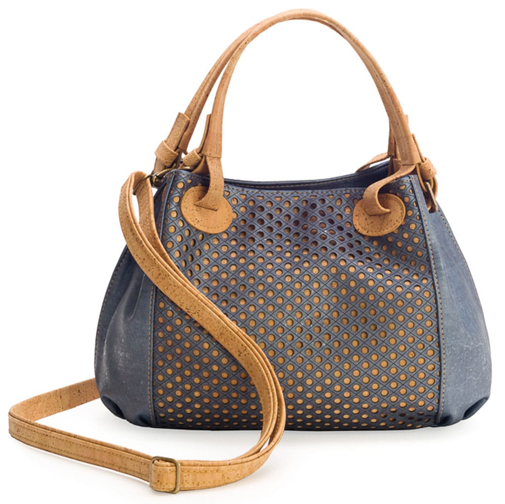 Korktasche «Ponto» metallic von Artelusa. Metallic-blau eingefärbter Kork mit Lasercut. Kann auch als Schultertasche verwendet werden.