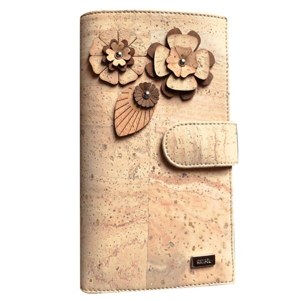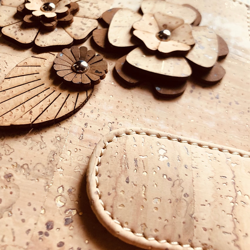 Portemonnaie «Cork Flowers» aus Kork von Artipel. Grosse Damen-Brieftasche mit Blumen aus Kork sowie goldfarbenen Einschlüssen.
