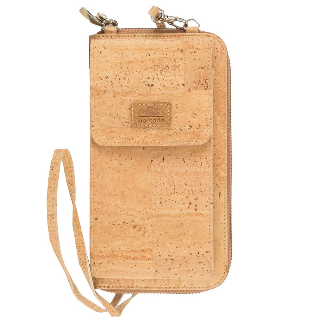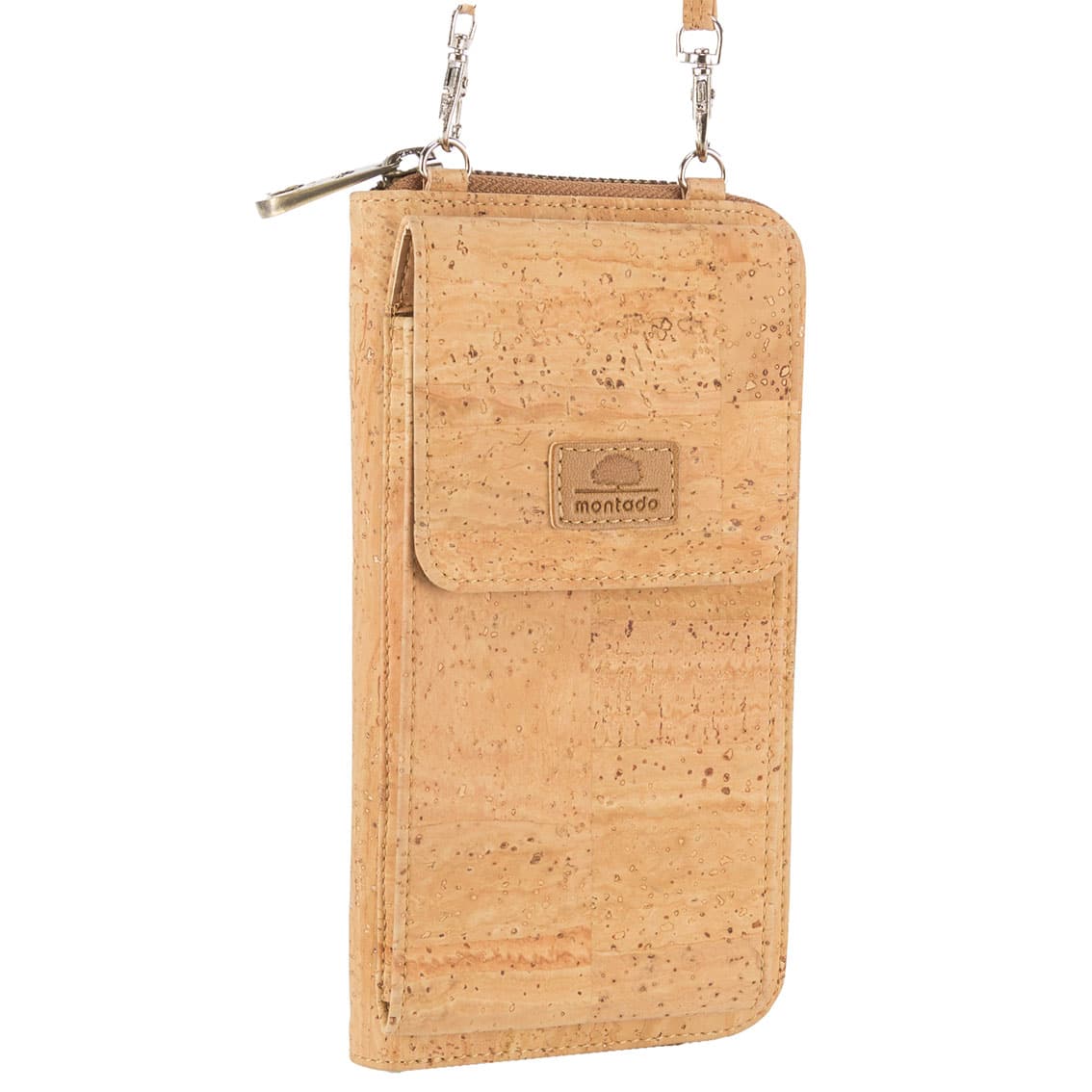 2 in 1: Portemonnaie mit Handy-Fach aus Kork von Montado. Mit verstellbarem, abnehmbarem Trageriemen.