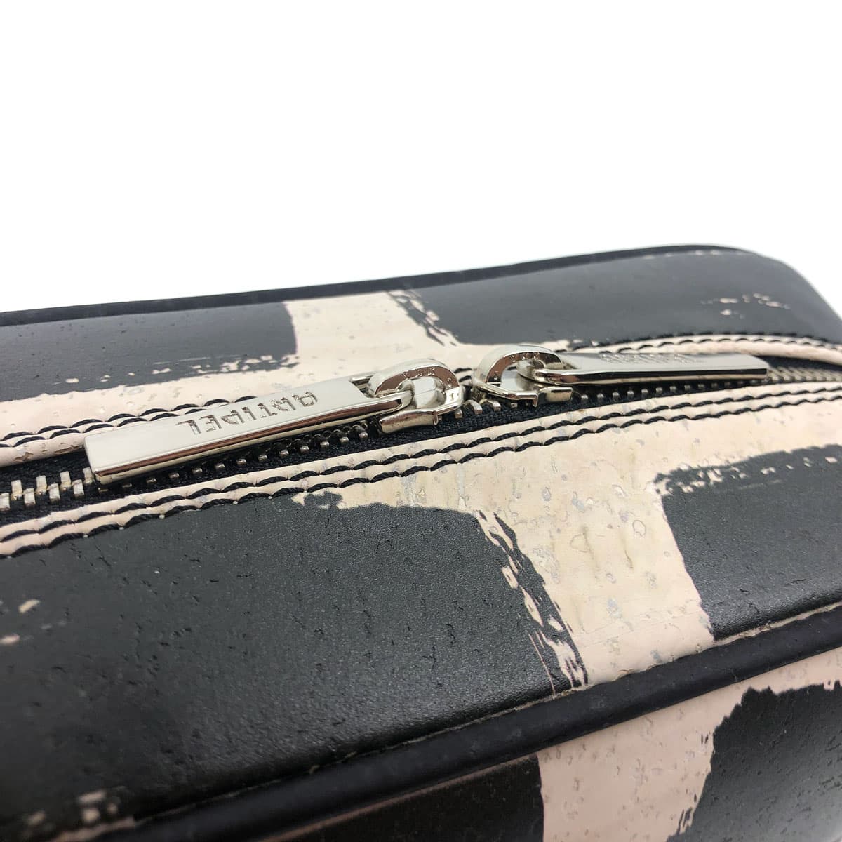 Umhängetasche aus Kork «BlackWhite» mit schwarz-weiss bedrucktem Korkstoff.