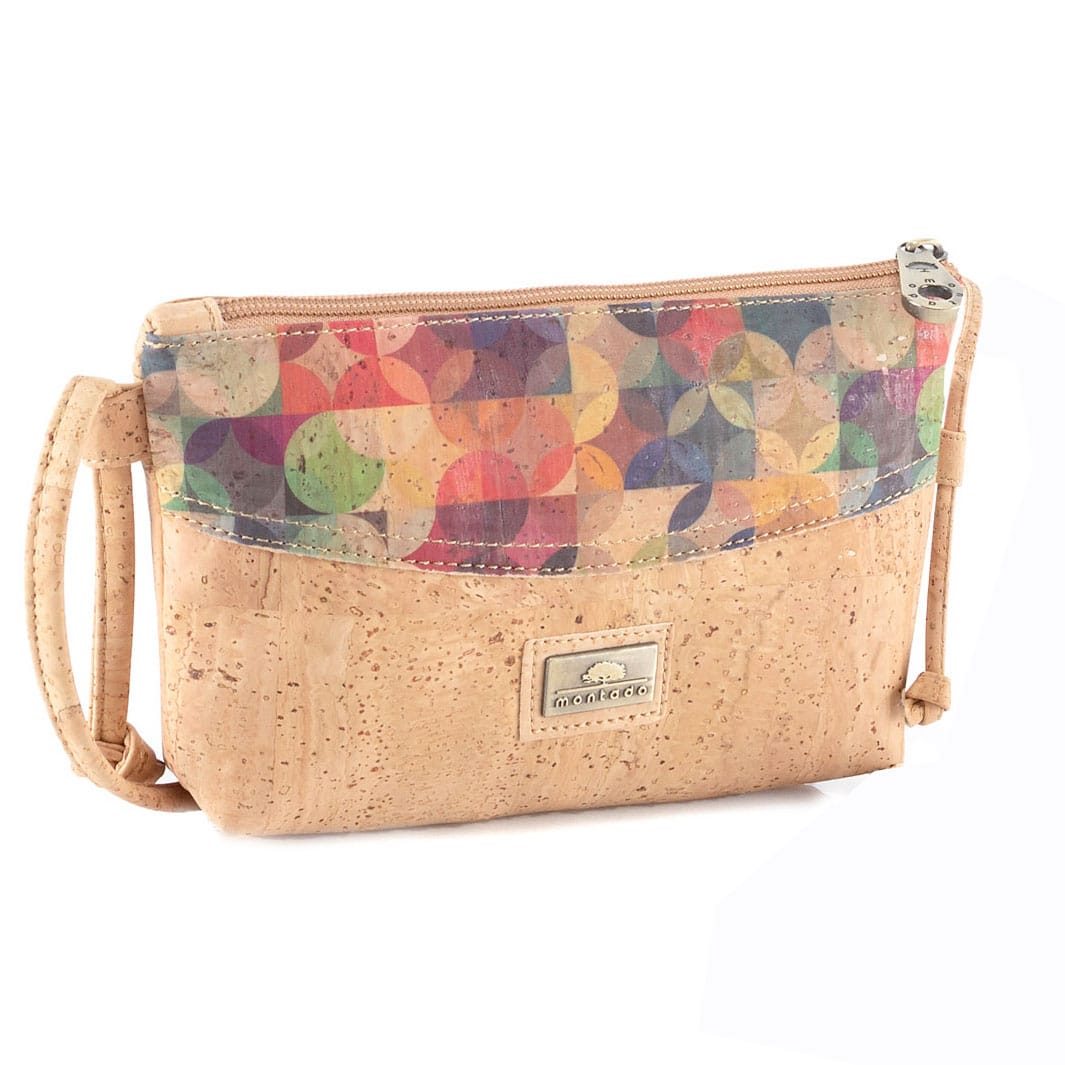 Umhängetasche aus Kork «Rainbow Stripe» von Montado mit verstellbarem Trageriemen und Reissverschlussfächern.