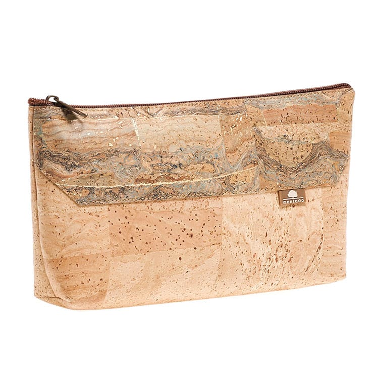 Umweltfreundliches Kosmetiketui aus Kork «Mapa Linha» von Montado mit Struktur sowie goldenen Einschlüssen.