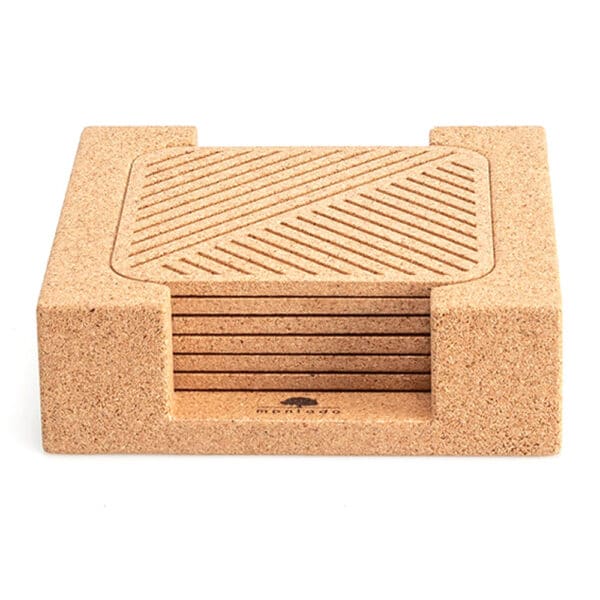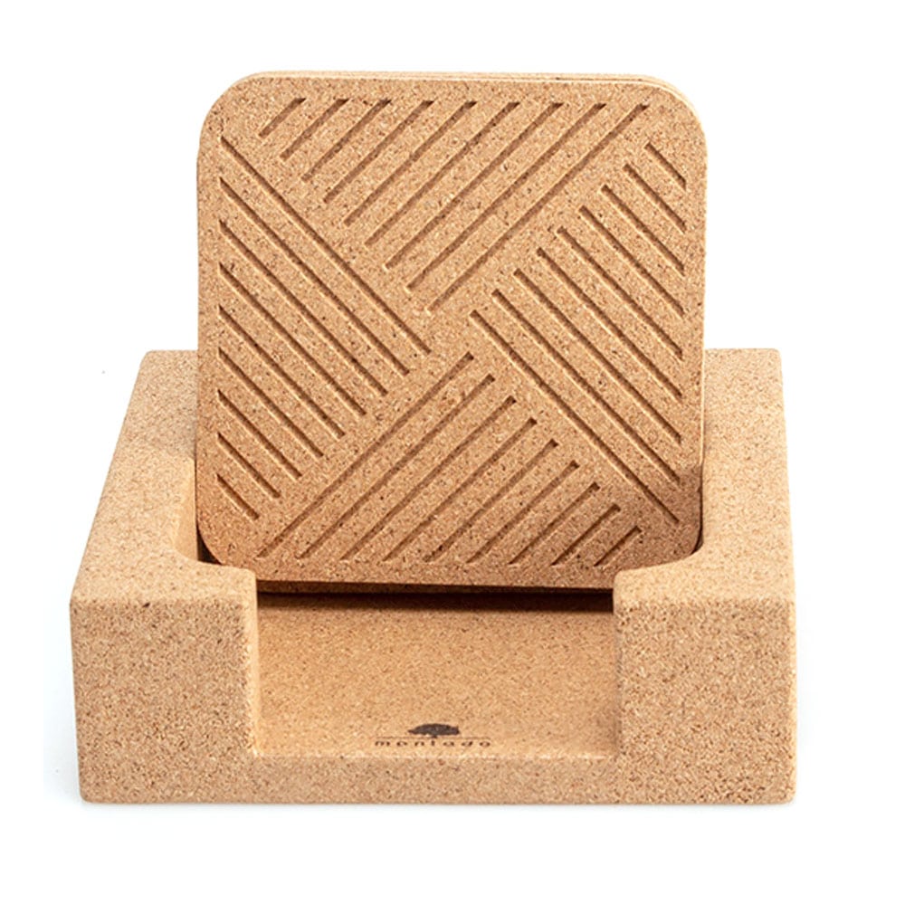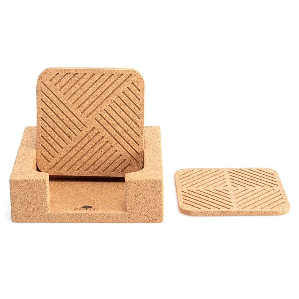 Das Untersetzer-Set aus Kork «Laser» von Montado besteht aus sechs quadratischen Untersetzern mit abgerundeten Ecken. Praktischer Aufbewahrungshalter aus Kork, wenn die Untersetzer nicht benötigt werden.