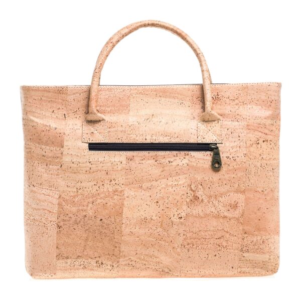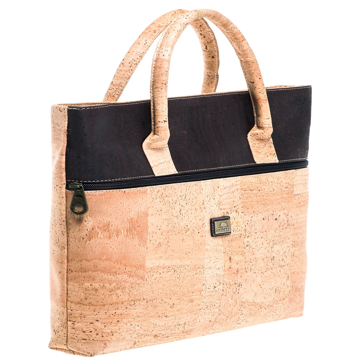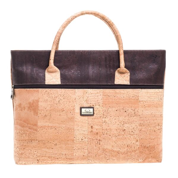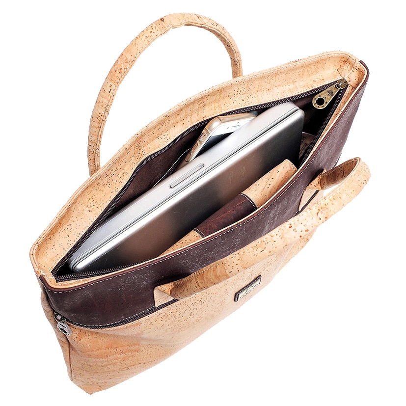 Vegane Computertasche aus Kork «Café» von Montado. Laptoptasche aus Naturkork mit dunkelbraunem Streifen, grossem Aussenfach sowie Platz für dein Notebook.