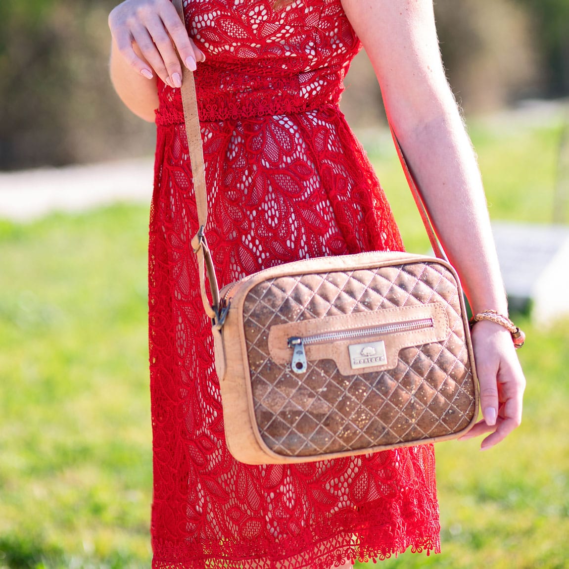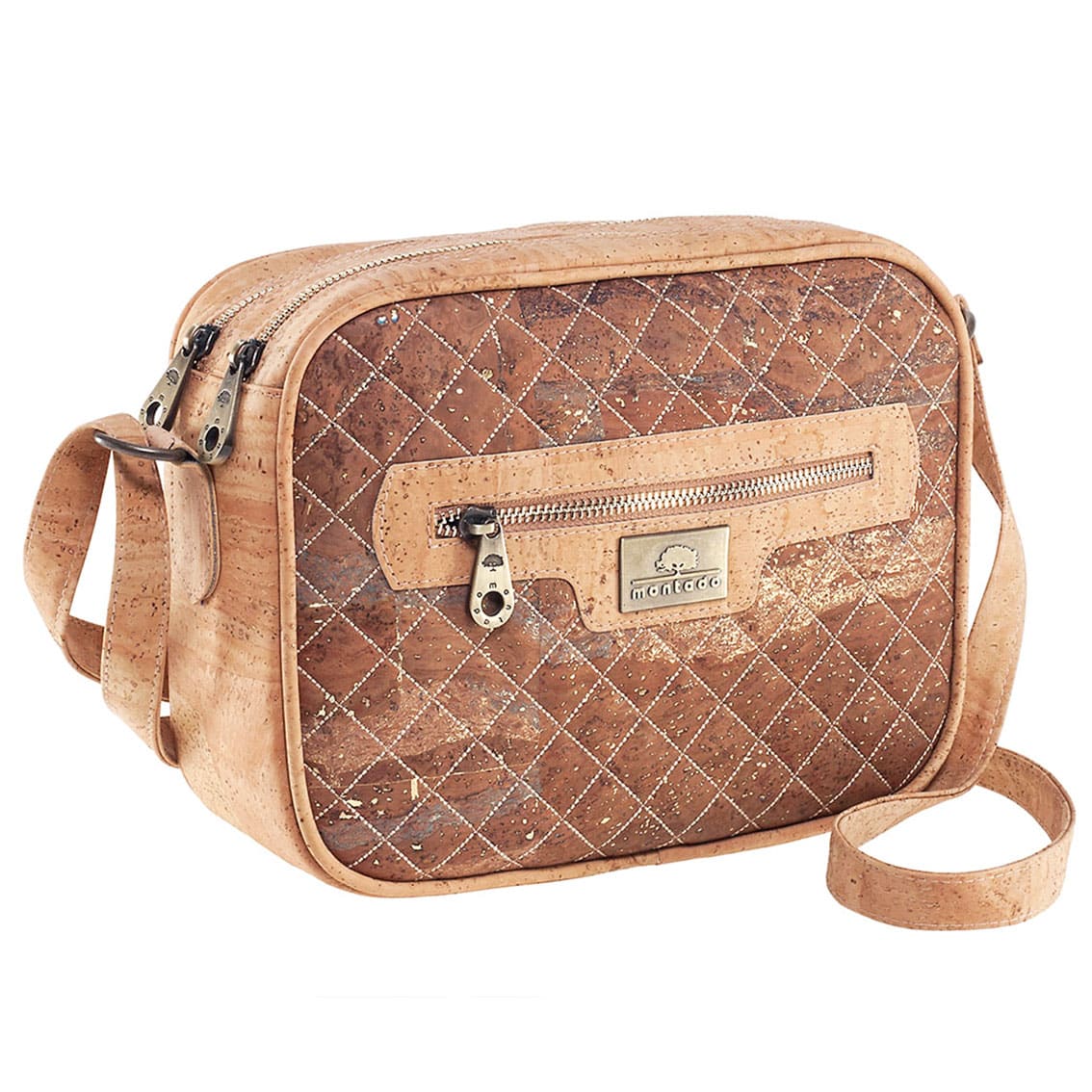 Vegane Kork Umhängetasche «Culatra» von Montado mit Kreuznähten sowie 2 grossen Reissverschlussfächern.
