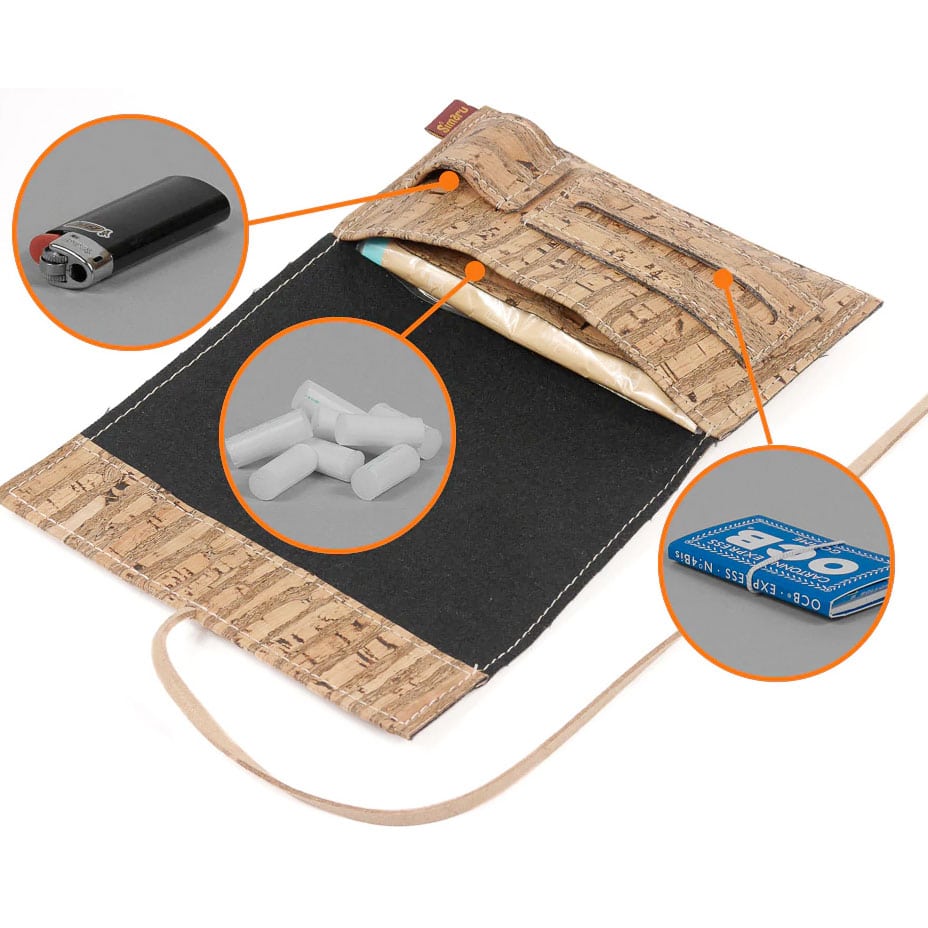 Vegane Tabaktasche aus Kork «Porto» raizes von Simaru. In diesem Tabaketui kannst du Tabak, Blättchen, Filter sowie Feuerzeug ideal verstauen.